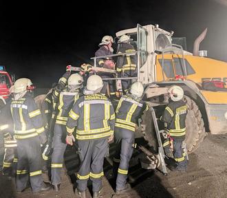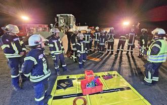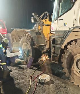Die weitaus schwierigere Ausbildungsstation an diesem Abend lag bei der Befreiung der eingeklemmten Person unter dem 17 t schweren Radlader. Damit die verunfallte Person unter dem Fahrzeug gerettet werden konnte, kam die Feuerwehr Elsterwerda mit ihrem Rüstwagen, kurz RW, zum Ausbildungsdienst hinzu. Mithilfe der auf dem RW verlasteten Hebekissen und dem zusätzlichen Unterbaumaterial wurde das Unfallfahrzeug gesichert und entsprechend unterbaut und später angehoben.