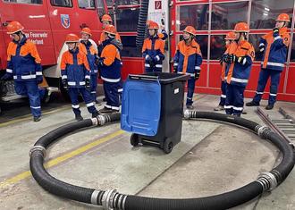 In einem Kreis, der aus 6 Saugschläuchen gebildet wurde, befand sich eine Mülltonne mit einem Gegenstand darin, welcher durch die Kinder geborgen werden sollte. Die Schwierigkeit für die Mitglieder der Jugendfeuerwehr bestand darin, dass die Saugschläuche und die Papiertonne nicht berührt werden durften. Ähnlich eines mögliches Einsatzszenarios: eine alte Grube, die nicht betreten werden darf, in der ein Tier eingebrochen ist, welches gerettet werden muss.