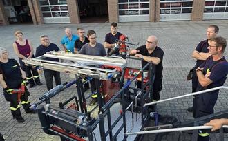 Bei der Drehleiter galt es das Gestell für die Krankentrage am Korb zu installieren. Das Gestell inkl. der Trage vom Rettungsdienst kommt zum Einsatz, wenn Personen aus oberen Etagen schonend und liegend gerettet werden müssen und das Treppenhaus bzw. die örtliche Bebauung zu eng für die Trage des Rettungsdienstes ist.