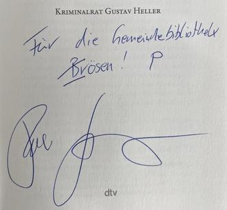 Ein wunderbares Ambiente bietet dieses historische Gebäude am Neumarkt ganz besonders für unterhaltsame Buchlesungen. Natürlich mischten wir uns unter das Publikum, um den Dresdner Autor Frank Goldammer zu erleben. Er las aus seinem neuesten Kriminalroman „Tod auf der Elbe“ und hatte eine wunderbare Art, uns Zuhörern die Protagonisten jeweils charakterlich näher zu beschreiben, so dass ein Jeder beim Zuhören wohl Kriminalrat Heller und Assistent Schrumm lebendig vor Augen sah. Die gesamte Atmosphäre stimmte an diesem Leseabend in der Preusker-Bücherei, denn draußen war es dunkel, sternenklar und drinnen lauschten wir der düsteren Handlung um Sabotage an einem Frachtdampfer, Erpressung und Mord vor der Kulisse Dresdens um 1879 – spannende Zeitgeschichte inklusive. Das Buch hat uns Frank Goldammer gern für die Gemeindebibliothek Prösen (auf sächsisch) signiert.