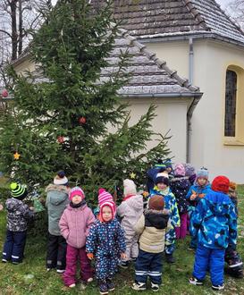 Beim Spaziergang durch Prösen stellte die Bienengruppe an der Kirche fest: Der Weihnachtsbaum steht schon da. „Der ist noch ganz nackig“ wurde einstimmig festgestellt. Also schnappten wir zusammen mit den Igelkindern schnell unsere Basteleien und zogen den Weihnachtsbaum an. Nun sieht er gleich viel besser aus und Freude hat es auch gemacht.