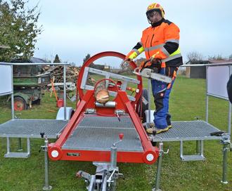 Mithilfe dieser Vorrichtung ist es möglich, Baumstämme einzuspannen und mittels einer kleinen Hydraulikpumpe auf Spannung zu bringen.