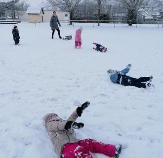 Neben einer Schneemannfamilie entstand auch der ein oder andere Schneeengel auf dem Sportplatz in Prösen. Mit roten Wangen und einem roten Näschen ging es dann wieder zum Aufwärmen zurück in den Kindergarten.