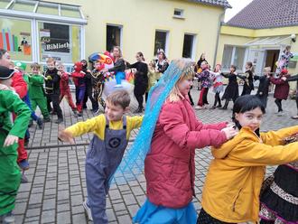 In Kooperation mit der Bibliothek Prösen führte Frau Lode eine märchenhafte Sportstunde in der Röderlandturnhalle durch. So musste das goldene Ei der goldenen Gans auf einem Löffel balanciert, die Linsen aus dem Märchen Aschenputtel (hier waren es Bälle) von einem Reifen in den anderen sortiert und die Schneeflocken von Frau Holle weggepustet werden. Teamarbeit stand dabei im Vordergrund, denn am Ende musste aus einem Buchstabenwirrwarr ein Lösungswort gebildet werden.