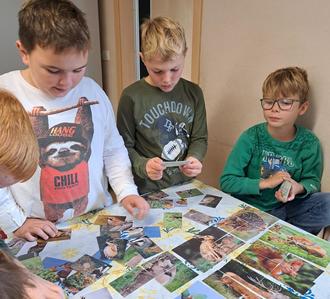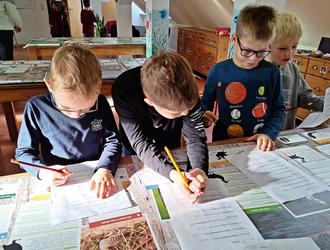 Der Tag mit den Jägern war sehr informativ und abwechslungsreich. Frau Sandy Klick und Herr Karsten Riedel, ansässige Jäger aus Stolzenhain, gestalten mit vielfältigem Material eine Art Stationsbetrieb: Tierspuren wurden gestempelt und dem passenden Tier zugeordnet, Quizfragen zu den Waldtieren, mit Hilfe von verschiedenen Plakaten, beantwortet. Dabei halfen die älteren Schüler den Erstklässlern beim Lesen und Schreiben. Spannend wurde es, als alle Kinder selbstständig den Hochsitz erklimmen durften und den Blick mit Hilfe eines Fernglases über die Natur wandern lassen konnten.