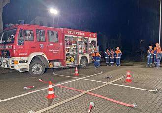 Nachdem das Spielfeld ausgeleuchtet wurde, konnten die Kinder „Tic Tac Toe“ mit Feuerwehrgeräten spielen.