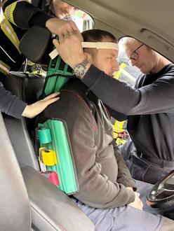 Im Vordergrund stand der Umgang mit dem „KED-System“. Verwendet wird dieses, wenn Verletzungen an der Wirbelsäule des Patienten nicht ausgeschlossen werden können und dieser aus seiner misslichen Lage gerettet werden muss. Dem Patienten wird dabei in der sitzenden Position das „Rettungskorsett“, so die Übersetzung, angelegt, so kann dieser sicher und stabil transportiert werden.