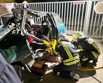 Simuliert wurde ein Seitenaufprall an einen Baum mit einer eingeklemmten und einer bewusstlosen Person. Das Unfallfahrzeug stammt aus einem reellen Einsatz der Feuerwehr der Gemeinde Röderland. Zu Ausbildungsbeginn wurde bekanntes Wissen zur Lagefeststellung, Sicherung der Einsatzstelle und erste Hilfe unter Einsatzbedingungen abgeprüft. Hierbei musste auch ein unter Schock stehender Ersthelfer betreut werden. Zügig wurde der bewusstlose Fahrer ohne technische Hilfsmittel gerettet.