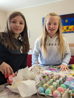 Für unseren geplanten Osterbrunch färbten die Kinder Eier auf kreative Art und Weise. Mit Hilfe von Küchenrolle und wasserlöslichen Farbstiften erhielten die Hühnereier eine bunte Farbenpracht und zierten das Frühstücksbüfett.