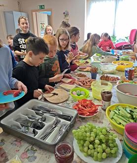 Außerdem bereiteten wir Dips und süßen Quark zu, schnippelten fleißig Gemüse und kreierten bunte Gemüsespieße verfeinert mit Käse und Wiener Würstchen. In gemütlicher Runde und österlicher Atmosphäre ließen sich alle die vielen Köstlichkeiten schmecken.