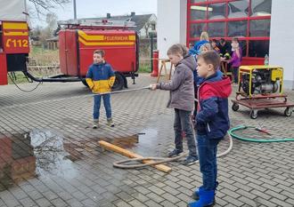 Am Tag darauf ging es zur Freiwilligen Feuerwehr in Prösen. Hier erhielten die Kinder einen Einblick in das Arbeitsfeld der Feuerwehr. Bei einer Führung durch das Feuerwehrhaus wurden den Kindern die Ausrüstungsgegenstände gezeigt und erklärt. Auch der Blick in das Feuerwehrauto durfte nicht fehlen. Egal ob Knotenkunde oder das Löschen eines „kleinen Feuers“ mit der Kübelspritze - es gab viel zu entdecken und zu erkunden.