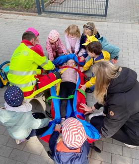 Schon am frühen Morgen herrschte eine gespannte Atmosphäre, als das Martinshorn des Rettungswagens in der Ferne zu hören war. Die Kinder staunten nicht schlecht, als das große Fahrzeug vorfuhr. Unter der fachkundigen Anleitung von einem Notfallsanitäter hatten die Kinder die einmalige Gelegenheit ein echtes Rettungsfahrzeug von innen und außen zu erkunden. Sie durften auf der Trage Probe liegen, verschiedene Geräte kennenlernen und die medizinische Ausrüstung bestaunen – ein unvergessliches Erlebnis für die Kinder. Ein besonderes Augenmerk lag dabei auf der Vermittlung von Erste-Hilfe-Grundlagen. Spielerisch wurde den Kindern erklärt, wie man im Notfall einen Notruf absetzt und welche Informationen dabei wichtig sind. Je besser die Kinder über die Arbeit im Rettungsdienst informiert sind, desto leichter fällt es ihnen, im Ernstfall richtig zu reagieren.