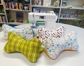 Eine Regelmäßigkeit hat sich bereits eingeschlichen, denn am zweiten Freitag im Monat wird in unserer Bibliothek genäht. Schon beim Arbeitsplatz einrichten merkte Frau Be., dass etwas fehlte – nämlich das Netzkabel - also rasch zu Hause ‚eine Tasche voll Strom‘ geholt. Für unser Projekt, einen Leseknochen, war nun alles bereit. Aus der Vielfalt an bunten Stoffen stellten wir unsere eigene Farbkombination zusammen und hefteten die drei ausgeschnittenen Teile – natürlich wieder schöne Seite auf schöne Seite – zusammen. Die Nähmaschinen ratterten los. Ganz wichtig war es, eine wenige Zentimeter breite Öffnung für die Füllwatte zu lassen. Aber wie das so ist … es wird genäht und dabei geschwatzt; immer wieder geht der prüfende Blick zum Nebenmann, der Ehrgeiz ist groß … aber dann: ‚Oh! Zugenäht. Hauptsache, noch große Striche gemacht.‘ Unser Nähkurs ist eine Ode an die Freude! Stets kreativ, manchmal herausfordernd, aber schlussendlich etwas für`s Herz!