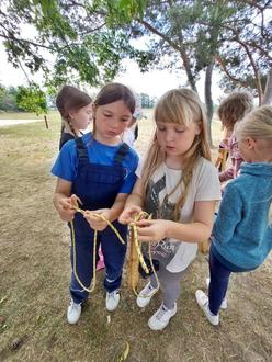 Danach begann für die Schülerinnen und Schüler der Stationsbetrieb mit praktischen Übungen. So konnten sich die Kinder die Feuerwehrtechnik und Fahrzeuge der Ortsfeuerwehr Prösen erklären lassen und selbst auch einmal einiges ausprobieren. Ihnen wurde etwas zur Knotenkunde erklärt und sie konnten selbst probieren, wie man z. B. einen Kreuzknoten bindet.