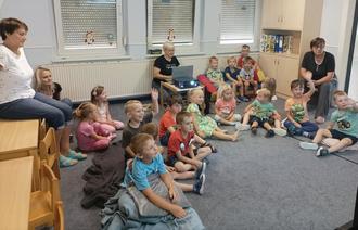 Sehr gefreut haben wir uns über die Kita-Kinder aus dem „Spatzennest“ Prösen am 9. Juli. Ganz neugierig schauten sich die Kleinen bei uns um. Die große Leinwand war schon aufgebaut im Lesesaal für das Bilderbuchkino „Lieselotte macht Urlaub“. Der Postbote macht Urlaub und schickt eine Ansichtskarte an seine Freunde. Da denkt die Kuh Lieselotte: ‚Ferien machen, das will ich auch!‘ Sie packt ihre Reisetasche und trabt zur Bushaltestelle. Aber es kommt kein Bus, und so trottet Lieselotte enttäuscht wieder Richtung Bauernhof. Aber schon nach wenigen Schritten entdeckt sie das perfekte Urlaubsziel: eine große Wiese. Hier hat Lieselotte jede Menge Ferienspaß – und den hatten die Kita-Kinder an diesem Vormittag in unserer Bibliothek auch.