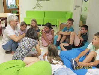 Endlich Sommerferien! Sehnsüchtig und voller Freude empfingen die Hortkinder Frau Lode am ersten Ferientag in Großthiemig. In gemütlicher Runde liest Frau Lode aus dem urkomischen Bilderbuch „Tagebuch einer Killerkatze“. Kuschel buddelt Löcher im Garten und schleppt tote Mäuse an, wie es eine Katze eben tut. Eines Tages zerrt sie den toten Hasen der Nachbarn durch die enge Katzenklappe. Oh Schreck – Kuschel als kaltblütiger Hasenmörder – oder doch nicht?
