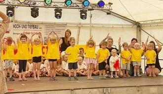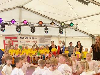 Froh gelaunt und fit wie „Theo“, machten viele Kinder unserer Kita beim Auftritt mit. Fangen, Werfen, Schwingen, Radschlag und Spagat gab es da zu zeigen. Die Tänze zu „Major Tom“ und „Wackelkontakt“ brachten dann auch zum Sonntagnachmittag Stimmung ins Zelt. Danke an die Eltern, die Ihre Kleinen zu diesem schönen Event brachten. Als Belohnung durften die Kinder am Montag nochmal die Hüpfburgen nutzen. Welch ein Spaß. Wir freuen uns jedes Jahr über die gute Zusammenarbeit mit dem SV 1919 Prösen.