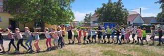 Im Sinne der Kinder fand am 01.06.2023 unser Kinderfest im Hort statt. Mit einer Polonaise eröffneten wir alle gemeinsam das Fest und starteten gut gelaunt in den Nachmittag. An verschiedenen Stationen wie bspw. Dosenschießen, Sackhüpfen, Rollerfahren, Torwandschießen, Leserätsel oder Seilspringen auf Zeit hatten die Hortkinder die Möglichkeit, sich vielfältig auszuprobieren und ihre Geschicklichkeit und ihr Können zu zeigen. Und auch an der Tattoo-Station sowie an der Hüpfburg war immer ein reges Treiben zu beobachten.