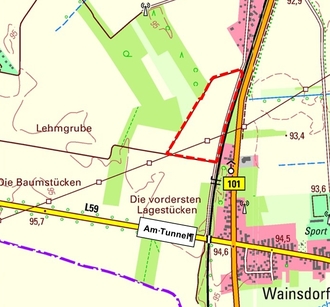 Abbildung 1: Übersichtskarte zur Lage des Plangebiets des Bebauungsplans „Photovoltaik-Freiflächenanlage – OT Wainsdorf“, nördliches Teilgebiet (rot gestrichelte Linie; Plangrundlage: DTK 10: © Geo Basis-DE/LGB 2025)