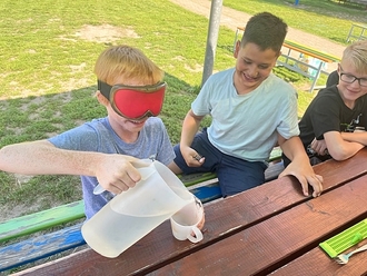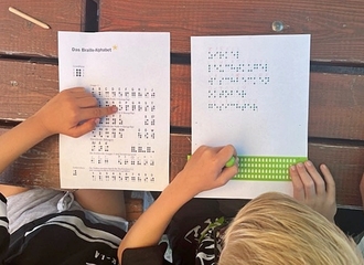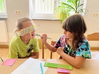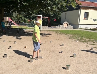 Thema unserer Ferienveranstaltung vom 11. bis 14. August in Merzdorf und Prösen war „Blindheit“. Sehschwache Menschen nutzen die Sinne Hören, Tasten und Riechen ausgeprägter als Sehende. Natürlich können sie die Blindenschrift erlernen, welche Louis Braille im Alter von 16 Jahren erfunden hat, nachdem der dreijährig auf beiden Augen erblindete. Die Hortkinder freuten sich zuallererst über das Bilderbuchkino, danach übersetzten sie ganz geduldig einige Wörter, die in Blindenschrift dargestellt waren. Sogar ihre Vornamen stanzten die Mädchen und Jungen in Braille auf Papier. Schwieriger wurde es, den Geschmack kleiner Snacks zu erraten, die man nicht sieht. Abschließend versuchte jedes Kind, ‚blind‘ einen Parcours zu bezwingen und sich dabei auf Zurufe des Kameraden zu konzentrieren. Die Tage darauf vertieften wir dieses Thema – es sollte doch gelingen, sich anzukleiden, obwohl man gar nichts sieht. Kleidungsstücke wurden ertastet und übergezogen; dabei passierte dann doch das ein oder andere kleine Malheur. Alltägliche Tätigkeiten, wie z. B. mit verbundenen Augen eine Schnitte schmieren oder Wasser in einen Becher gießen, klappten wirklich gut. Hierbei vertrauten die Kids auch ihren Geruchs- und Tastsinnen. Allen Teilnehmern haben diese lehrreichen Tage super gefallen und es gibt bereits den Wunsch für eine Wiederholung in den nächsten Schulferien.