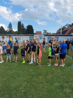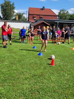 … Stunden der Unvergessenheit, aller Mitstreiter & Teilnehmer & Organisatoren und Helfer…. Fazit: Am Tag des Geschehens standen alle angemeldeten Teilnehmer (16 Kinder und Erwachsene) voller Elan und in gut gelaunter Wettkampfstimmung in den Startlöchern. Alle 13 Stationen wurden immer unter Berücksichtigung der Gruppenaufteilung Kinder gegen Erwachsene durchgeführt. Die Vergabe der Punkte erfolgte nach Absolvierung der jeweiligen Station durch die beiden Assistenten Ronny Zühlke und Ursel Böhme. (Gewinner der jeweiligen Station bekamen 2 Punkte und Verlierer nur 1 Punkt) Anja Petersen & Ramona Sauer unterstützten den Event gleich zu Beginn mit einer Erwärmung aller Teilnehmer. An den Stationen gaben sie den Wettstreitern Hinweise und Anregungen zur Durchführung.