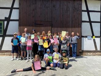 Schautafel im Ort, Artikel in dieser Zeitung oder als Information aus der Schule … viele Wege führen dazu, dass in der zweiten Ferienwoche im Sommer wieder viel Bewegung auf unserem Pfarrhof und in der Scheune war. Für den Bildhauerkurs bei Sebastian Harbort fanden sich acht Mädchen und Jungen ab 12 Jahren, die neugierig waren, was in ihrem Stein versteckt war. Einige waren schon alte Hasen, doch auch die Beginner fanden schnell ihre Idee. Dabei stellte sich heraus, dass auch das Einfache schwer sein kann, wie Clara bei ihrer Amphore merkte. Oder umdenken war gefordert: aus dem Stein platzte das Stück, welches eigentlich der Kopf werden sollte oder eine Idee wurde ganz verworfen und es entstand ein Mann mit Bart. Marie hatte eigentlich nicht so große Lust, doch die kam, je mehr ihr Stein nach Erdbeere aussah und am Ende machte ihr das Herausarbeiten der Feinheiten am meisten Spaß. Auch die Kinder, insgesamt zwölf, welche unter der Anleitung von Jiang Bian-Harbort mit dem gespitzten Bleistift erwartungsvoll vor einem weißen Blatt saßen, waren sehr zufrieden mit ihrer Ferienwoche. Bei den einen war es das ruhige Abzeichnen des aufgebauten Stilllebens. Die anderen fanden die Ausflüge Richtung Eisdorf zu den Kühen gut. Die Kinder bekamen gutes Rüstzeug an die Hand, denn Frau Harbort weihte sie in die Geheimnisse der Schattierung ebenso ein wie in die Anatomie einer Kuh. Am Ende waren sich alle einig: es gab genug Pausen zum Ausruhen, kichern, essen, miteinander spielen. Der Zauberwürfel stand hoch im Kurs. Der Ferienkurs wurde unterstützt vom Jugendamt des Landkreis Leipziger Land, dem Kirchenkreis Merseburg, privaten Sponsoren und der Kirchengemeinde Hohenlohe-Kitzen.