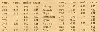 Es fuhr sogar schon ein Eilzug, erstaunlich die damals gefahrene Reisegeschwindigkeit. Die Stundenzeiten wurden früher nicht wie heute in Fahrplänen von 0 – 24 Uhr angegeben, sondern jeweils von 1 – 12 Uhr vormittags und 1 – 12 Uhr nachmittags, wobei später die Minuten von 6 Uhr nachmittags bis 6 Uhr vormittags zu besseren Unterscheidung unterstrichen wurden. Waren es damals für den Bahnhof Pegau täglich 12 Zugfahrten, so hat er 1974 täglich 108 zu bewältigen. Der Leipziger Endbahnhof war damals der Thüringische Bahnhof, der sich auf dem Gelände des jetzigen Magdeburg – Thüringischen Güterbahnhofes – an der Westseite des heutigen Hauptbahnhofes – befand. Der Bahnhof Barneck ist jetzt Leipzig-Leutzsch. Die Bahnhöfe und Haltstellen Gohlis, Möckern, Großzschocher, Bösdorf, Profen und Bornitz wurden erst später auf Ersuchen der dortigen Behörden eingerichtet und in Betrieb genommen.