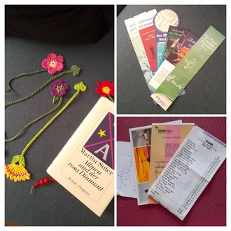 In den uns überlassenen Büchern tauchen hin und wieder kleine Zettelchen, Postkarten und verschiedene Einlagen auf. Es sind „Lesezeichen “, die die Leser zur Erinnerung eingelegt haben, wo sie aufgehört haben zu lesen. Vielleicht auch um eine besondere Stelle zu markieren, die sich lohnt, noch einmal zu lesen. Im beigefügten Bild sehen Sie einige von Ihnen. Aber auch eine kleine Variante, die sich unsere Steffi ausgedacht hat. Sie ist ein Häkeltalent. Diese kleinen Blümchen sind mal eine andere individuelle Variante.