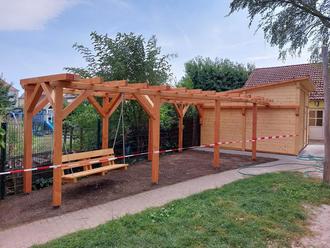 In der Kita Knirpsenland darf jetzt geschaukelt werden und die zahlreichen Fahrzeuge haben mit der tollen Gartenhütte eine neue uns schicke Garage.