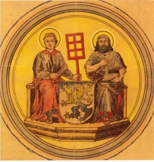 Ein halb goldenen und halb silberner Löwen in blauem Feld, dessen Schild vom heiligen Laurentius zur Rechten und Sankt Johannes zur Linken, sitzend auf zwei Stühlen, gehalten wird.