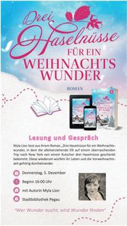 Myla Lion liest aus ihrem Roman „Drei Haselnüsse für ein Weihnachtswunder, in dem die alleinerziehende Elli auf einem überraschenden Trip nach New York von einem Kutscher drei Haselnüsse geschenkt bekommt. Diese wiederum würfeln ihr Leben und die Vorweihnachtszeit gehörig durcheinander.