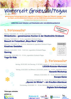 Die Jugendbüros Pegau und Groitzsch der Diakonie Leipziger Land haben in Zusammenarbeit mit der Stadt- und Schulbibliothek Groitzsch und dem NABU-Naturschutzzentrum Groitzsch jede Menge Spaß und Action für die Winterferien geplant. Eine ausführliche Beschreibung sowie die Teilnahme- und Fotoerlaubnis können sich Interessierte unter www.bibliothek-groitzsch.de herunterladen und ausgedruckt in den Jugendbüros abgeben. An allen Aktivitäten können Kinder und Jugendliche zwischen 8 und 16 Jahren teilnehmen. Die Teilnehmerzahl ist begrenzt. Es gelten die aktuellen Hygienebestimmungen. Bei Fragen zur Anmeldung stehen die Mitarbeiter der Jugendbüros zur Verfügung.