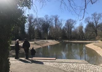 In der Frühlingssonne blicken sie auf den neu angelegten Teich des Klostergartens. Sanft schimmert das erste Grün an den Zweigen der Bäume.