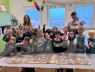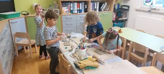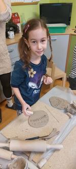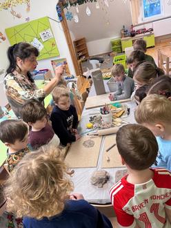 Schon neugierig beobachteten die Vorschulkinder die Vorbereitungen fürs gemeinsame Töpfern. Nach einigen wichtigen Erklärungen machten sich die großen Vorschüler ans Werkeln. Zuerst wurde der Ton geschlagen, d.h. auf eine Platte geworfen, um Lufteinschlüsse zu entfernen. Danach rollten die Kinder den Ton aus, wählten beliebig die Grundform und ritzten ihren Namen auf die Fläche. Danach wählten die Schlaufüchse verschiedene Stempel, Rollen oder Stoffe zum Verzieren und Schmücken der Flächen. Es entstanden tolle Kunststücke – jetzt warten wir alle gespannt auf die fertig gebrannten Namenschilder, die wir dann noch mit bunten Glasuren bemalen wollen.