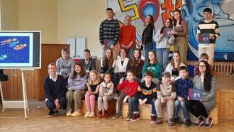 Ukrainische Schülerinnen und Schüler aus der Oberschule Pegau stellen ihr eigenes selbst gestaltetes Buch vor.