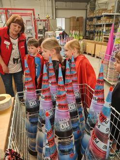 Nach einer einstündigen gemütlichen Fahrt erreichten wir unser Ziel, die Zuckertütenfabrik. Sehr freundlich und liebenswert wurden wir von Petra, einer Mitarbeiterin der Fa. Roth, begrüßt. Bevor wir in die große Halle hineindurften bekamen alle Schulanfänger einen Umhang.