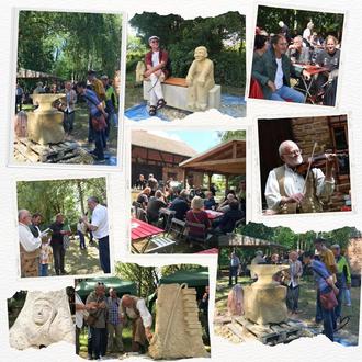 Nach zwei Wochen stellen bei einer kurzweiligen Vernissage die Bildhauer Erich Friedrich Becker (Orlamünde), Markus Petersen (Leipzig) und Rainer Pleß (Pegau) ihre Werke vor. In idyllischer Umgebung lassen es sich die Besucherinnen und Besucher mit gekühlten Getränken und frisch Gegrilltem während der Vorstellung gut gehen. Die Pleß’sche Idee „Besetzte Bank“ geht tatsächlich in Serie. 2021 hat Rainer Pleß in der LVZ angekündigt, er werde wohl nur noch Bänke für Pegau machen. Dieses Jahr hat er einen Kobold auf die Bank gesetzt. Bald können Sie sich neben ihn setzen. Er ist offen für Selfies und hört auch gern zu, sogar ohne Wiederworte. Markus Petersen erhielt dieses Mal den Auftrag für den Ortsteil Wiederau eine Skulptur zu schaffen, welche die Schmiede Wiederaus hervorhebt. Mit schwarz lackierten Werkzeugutensilien der Pegauer, auch eines vom Bürgermeister, wird die Sandsteinfigur komplettiert. Herr Becker sagt in seiner Ansprache „aus den Blöcken wird etwas Neues geschaffen. Es ist eine Verwandlung.“ Die heitere Muse Thalia lächelt aus seiner Skulptur heraus. Die Symbole Hirtenstab (ländliche Dichtung), Efeuranken (Efeukranz) und die heitere Maske (Theater/Komödie) fanden ihren Platz neben dem fein herausgearbeiteten Stapel Bücher (Epik). Der belesene Künstler bereicherte das Fest nicht nur mit seinem berührenden Geigenspiel, sondern auch mit der Aufklärung des Buchhändlers Thalia: 1843 eröffnete in Hamburg das Thalia Theater. Als Namen wählte sich Schwartzenberger (Chéri Maurice) Thalia, die Muse der komischen Dichtung und Unterhaltungskunst. Alfred Schulze war es, der die Buchhandlung Thalia am 15. August 1919 im Gebäude des Thalia Theaters eröffnet hatte. Daraus entwickelte sich eines der größten Buchhändler unserer Zeit.