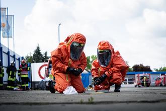 Parallel dazu waren Spezialkräfte gefordert, einen inszenierten Gefahrgutunfall zu bewältigen. Hierbei mussten verschiedene Stationen durchlaufen und anspruchsvolle Aufgaben unter hohen Sicherheitsvorkehrungen abgearbeitet werden. Ziel war es, Abläufe für den Ernstfall zu festigen und die Zusammenarbeit zwischen den Einheiten zu optimieren.