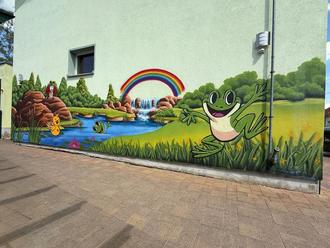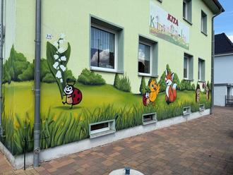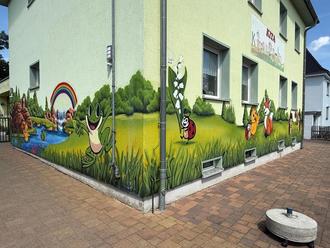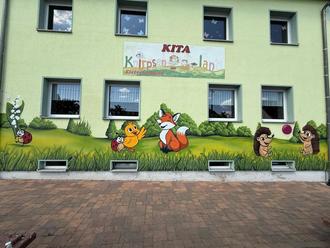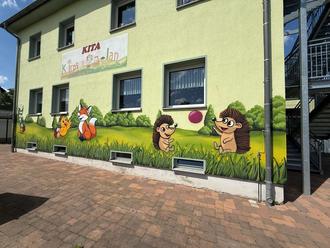 Die Fassade der Kita Knirpsenland Elstertrebnitz wurde mit wunderschönen Wandbildern verschönert, fröhliche Tiere, bunte Farben und jede Menge Natur sorgen für gute Laune schon beim Ankommen!