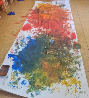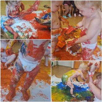 Die Farben in ihrer Vielfalt zu erleben, fühlen und sich auszuprobieren erweckte die Lust auf noch mehr zu Entdecken. Ganz alleine malten sie Hand- und Fußabdruck und eroberten die ganze Fläche. Mit Farbe zu matschen und experimentieren machte den Farbkindern richtig Spaß. Zum Schluss waren sie ganz mutig, Arme und Beine färbten sich in allen Farbvarianten. Sie bemalten sich selbst oder dem Gegenüber.