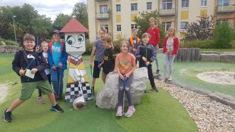 Beim Minigolf spielen auf der Anlage des Abenteuergolfplatzes Groitzsch verfielen die Kinder in Wettkampfstimmung. Geduldig wurde probiert, so wenig Schläge wie nötig pro Bahn zu erreichen, um die anderen Kinder zu übertrumpfen.