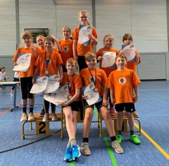 Kreismeister mit einer Goldmedaille im Dreierhopp wurde Tomke aus der 4. Klasse. Ebenfalls errang er die Bronzemedaille im Hochsprung.