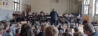 Das Schuljahr neigt sich dem Ende zu, dies war für die Grundschule „Geschwister Scholl“ in Sandersleben ein triftiger Grund zum Feiern. Am 04.06.2024, anlässlich des Kindertages und in Verbindung mit dem “Tag der offenen Tür“ begannen die einzelnen Klassen mit einem gemeinsamen Frühstück den Tag. Plötzlich gab es riesige Aufregung als ca. 30 Polizisten und Polizistinnen mit einem Bus ankamen. Es war das Orchester der Polizei Sachsen-Anhalts. Als diese in der Turnhalle aufspielten waren alle Kinder, Angestellten und Gäste begeistert. Wir lernten nicht nur die einzelnen Instrumente kennen, sondern erfuhren ebenfalls, welches das lauteste, das leiseste, das größte, das kleinste, das teuerste oder auch das billigste ist. Die Kinder waren kaum auf den Plätzen zu halten als die Titelmusik von der Sesamstraße oder auch von der Sendung mit der Maus zu hören war. Auch gab es einen riesigen Gänsehautmoment als eine Sängerin „Das Farbenspiel des Windes“ aus Pocahontas vortrug.