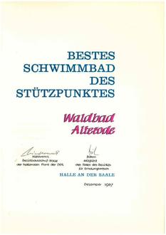 Urkunde „Bestes Schwimmbad des Stützpunktes“, Dezember 1987