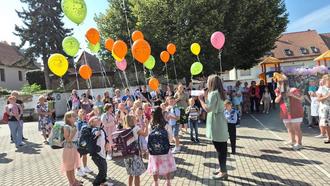 Nun wurde es Zeit, die Kinder lernten mit Frau Amtmann ihren Klassenraum kennen. Als nun die offizielle 1. Klasse zum Schulhof zurückkehrte, wurden sie mit einem tollen Applaus empfangen. Die Kinder hatten Luftballons an ihren Händen, diese wurden jetzt gemeinsam mit allen Wünschen für die Zukunft in die Luft geschickt.