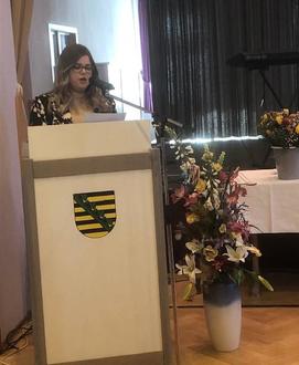 Luisa Friedrich vom Freundeskreis zur Förderung der Seniorenarbeit der Dr. Willmar Schwabeschen Senioreneinrichtungen e.V. übernahm die Laudatio auf Ingrid Porstmann, die leider nicht anwesend sein konnte.