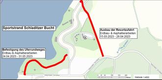 Seit Ende letzten Jahres werden am Sportstrand der Schladitzer Bucht bauvorbereitende Maßnahmen für den Ausbau der Verkehrserschließung durchgeführt. Ab Mitte März 2023 werden Erdbau- und Asphaltierarbeiten an der Zufahrtsstraße zum Resort (Anglerstraße) durchführt. Ende April soll die Resortzufahrt fertiggestellt werden. Am Uferrundweg gehen die Bauarbeiten nahtlos weiter. Mit einer Fertigstellung der Bauarbeiten ist Ende Mai 2023 zu rechnen.