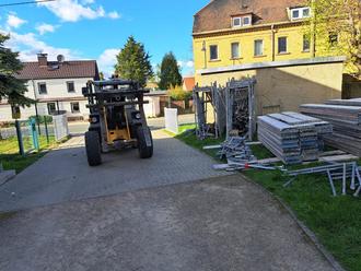 Mit Unterstützung von Herrn Jürgen Beyer, welcher die Erlaubnis erteilte sein Grundstück zu überfahren, der tatkräftigen Hilfe vom Bauservice Schäbe und seiner Technik, sowie unserer Bauhofmitarbeiter wurden die Gerüstteile mit Muskelkraft zu einer Stelle an der Leipziger Str. transportiert, die für den LKW der Gerüstbaufirma anfahrbar war.