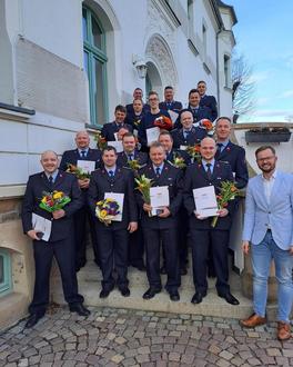 Der Bürgermeister bedankte sich bei den Kameraden, die sich vom 25. Juli bis zum 31. Juli 2022 bei den schweren Waldbränden im Grenzgebiet der Gemeinde Arzberg (Nordsachsen) und der Stadt Falkenberg (Brandenburg) im Einsatz befanden. In diesem würdigen Rahmen übereichte er die Waldbrandmedaille des Freistaat Sachsen und bedankte sich herzlich für den Einsatz. Insgesamt 16 Kameraden und eine Kameradin waren beteiligt.