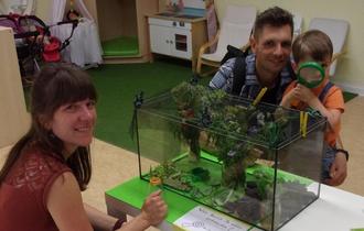 Im Dachgeschoss bei den „Seepferdchen“ konnten sich die Eltern auf Entdeckungsreise auf einen Wiesenpfad begeben. Seit einigen Wochen beschäftigten sich die kleinen Seepferdchen bereits mit verschiedenen kleinen Krabbeltierchen. Begleitet von Grillenzirpen und anderen Insektengeräuschen aus den Lautsprechern bastelten sich die Kinder mit ihren Eltern Bienen-, Schmetterlings- oder auch Marienkäfermasken; beobachteten verschiedene Insekten mit einer Lupe in unserem Terrarium, pusteten mit Strohhalmen Papier-Raupen über den Tisch und krabbelten als Ameise über den Parcours. Auch die verschiedenen Entwicklungsstadien der Biene konnten begutachtet und von leckerem Honig probiert werden.